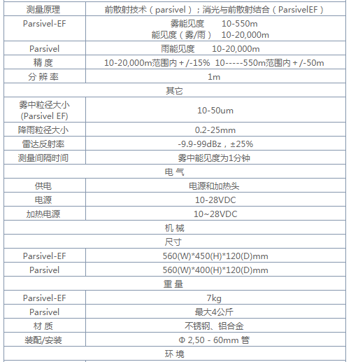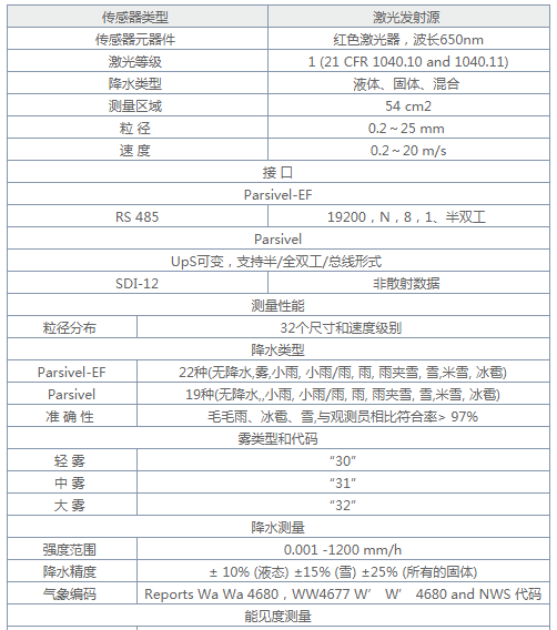 Parsivel-EF 使用激光散射进行降水与雾的测量。传感器的变送器单元可以产生一束水平光,接收器单元可以将这束水平光转换成电子信号,在测量区域内的任意位置,当空气颗粒物降落穿过光束时,信号会发生变化。 亮度变暗的程度反映空气颗粒物粒径的大小,根据信号的持续时间推导出下降速度。Parsivel-EF采用激光散射接收,接收平行光测量降水天气现象,另一束用来测量雾能见度。