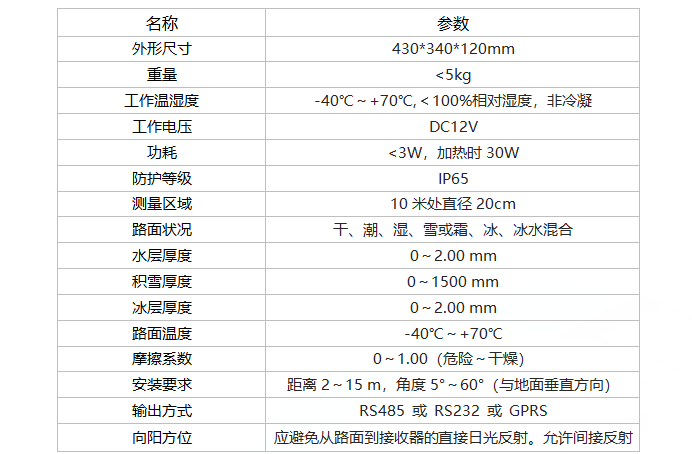 ●光谱分析原理,检测路面积水、结冰、积雪与冰层的厚度;还可监测常规气象要素。