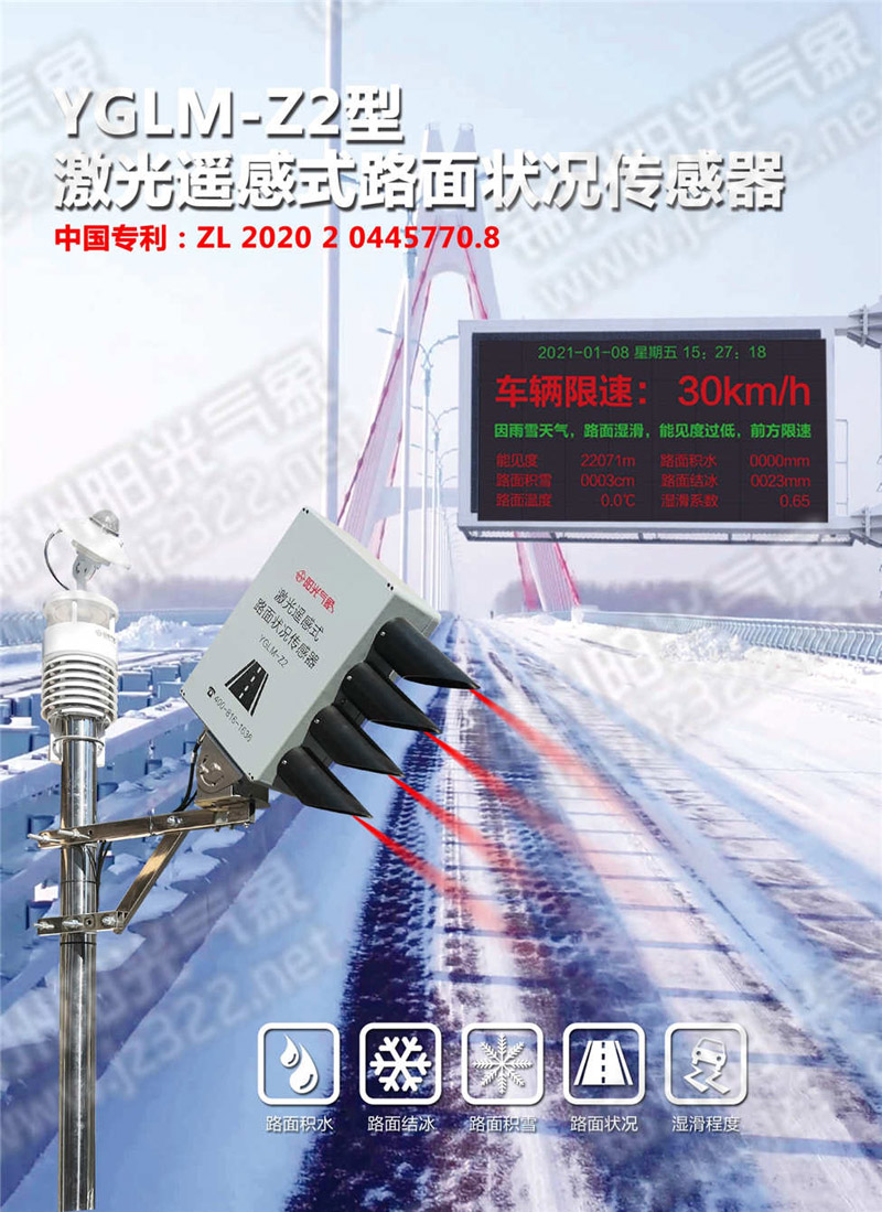 YGLM-Z2型激光遥感式路面状况传感器采用多光谱测量技术,传感器不需要植入路面内即可准确地检测出道路表面结冰、积雪、水膜的厚度及湿滑程度、路面温度等要素,监测仪集成了微型处理器来识别道路或机场跑道的路面状态。