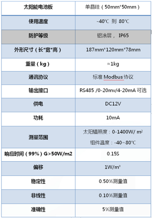 硅基辐照度传感器是锦州阳光气象科技有限公司根据太阳能电池板的特性,专门为光伏发电行业研制的一款低成本、高可靠性的太阳辐照度测量传感器。其传感器的本身,采用硅基结构与光伏板的结构及其相似,是一个十分理想的参照系统。特别是它的光谱响应以及倾斜误差都与光伏板极其相似,这让使用硅基传感器来精准的分析光伏板辐照度数据,有据可循。