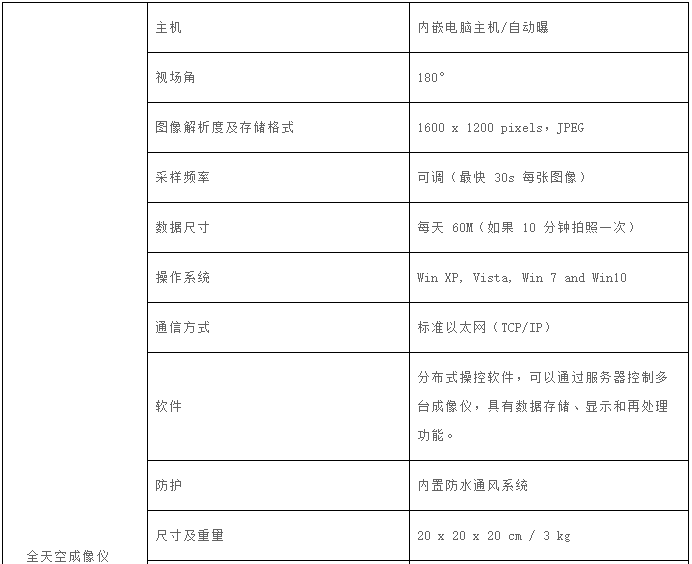 该产品主要由成像部分、环境保护系统组成,成像部分是一款高性能带鱼眼镜头的数字成像系统,定时拍摄获取全天空可见光红、绿、蓝三波段图像,采样频率最短为30秒;环境保护系统是根据不同的外场环境而设计的温控系统和防雨雪装置等。