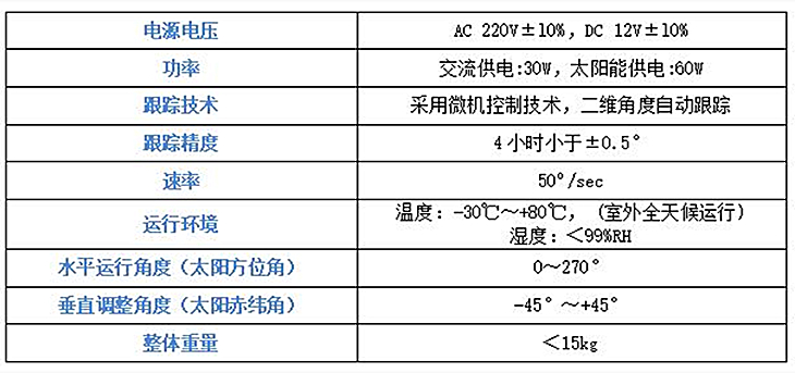 仪器由底座、台架、丝杠、齿轮箱、电机、微机控制器、辐射传感器、电源等部分组成。跟踪软件按照太阳运动轨迹与光追踪相结合方式运行。采用二维自动跟踪方式,太阳赤纬角跟踪自动调整,可实现全天侯自动对太阳的实时追踪。