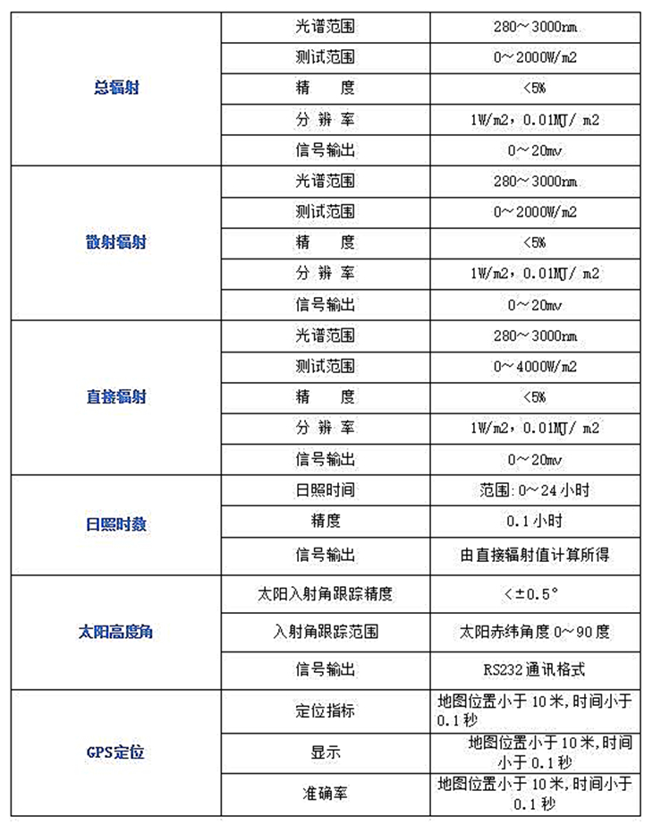 测量太阳辐射要素: 总辐射,直接辐射,散射辐射,日照时间,太阳高度角,经度,纬度,海拔高度,GPS时间。