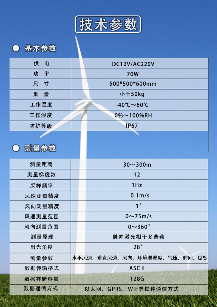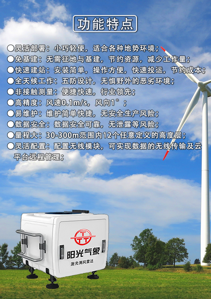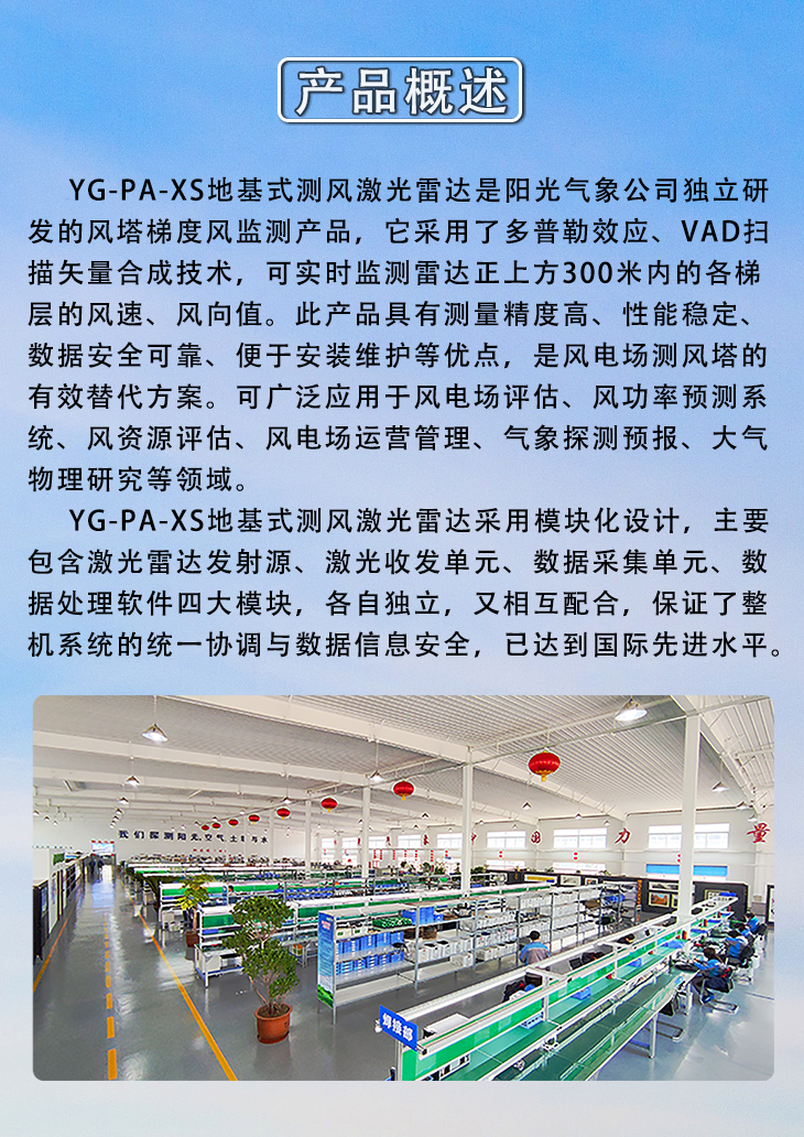 YG-PA-XS地基式测风激光雷达是阳光气象公司独立研发的风塔梯度风监测产品,它采用了多普勒效应、VAD扫描矢量合成技术,可实时监测雷达正上方300米内的各梯层的风速、风向值。此产品具有测量精度高、性能稳定、数据安全可靠、便于安装维护等优点,是风电场测风塔的有效替代方案。可广泛应用于风电场评估、风功率预测系统、风资源评估、风电场运营管理、气象探测预报、大气物理研究等领域。 YG-PA-XS地基式测风激光雷达采用模块化设计,主要包含激光雷达发射源、激光收发单元、数据采集单元、数据处理软件四大模块,各自独立,又相互配合,保证了整机系统的统一协调与数据信息安全,已达到国际先进水平。