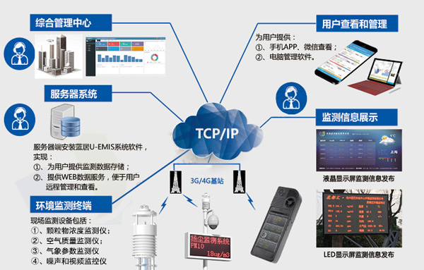 本系统由颗粒物监测系统、噪声监测系统、气象监测系统、视频监控系统、无线传输系统、供电系统和后台数据处理系统及云信息监控管理平台组成。监测子站集成了大气PM2.5、PM10监测、环境温湿度及风速风向监测、噪声监测、视频监控及污染物超标视频抓拍(选配)、有毒有害气体监测(选配)等多种功能;数据平台是一个互联网架构的网络化平台,具有对各子站的监控功能以及对数据的报警处理、记录、查询、统计、报表输出等多种功能。