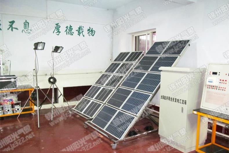 2、光伏发电实训实验装置可以自动跟踪太阳运转,使太阳光垂直照射到物体表面,保证跟踪架上产品获得最大太阳辐射能量,系统由底板、支架、丝杠、液压、齿轮,步进电机,电脑控制器,电源等部分组成。