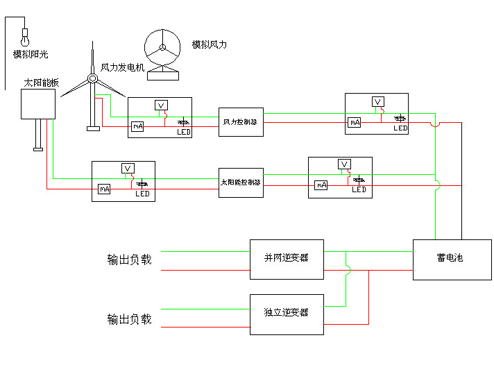 连接太阳能发电系统相关配件,逆变器输出220VAC,添加交流负载(详见离网型逆变器逆变器工作原理图)。