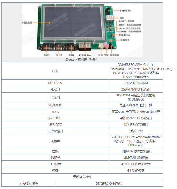 Cortex A8嵌入式网关的核心CPU采用美国TI(德州仪器)OMAP3530双核CPU,600MHz ARM Cortex-A8主处理器430MHz TMS 320C 64x+ DSP协处理器,POWERVR SG™ 2D/3D加速引擎。独立的电源管理模块,采用集成度极高的TI公司TPS65930芯片,实现核心板电源管理的智能化和低功耗,核心板可以与网关母板分离,直接插拔,并可以独立工作。