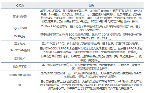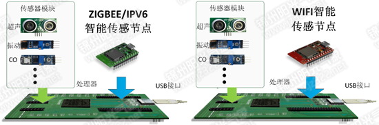 每个节点基于"传感器+处理器"的架构,可以独立运行,配合20 多种传感器模块,满足物联网专业"智能传感器"相关课程的教学实验。