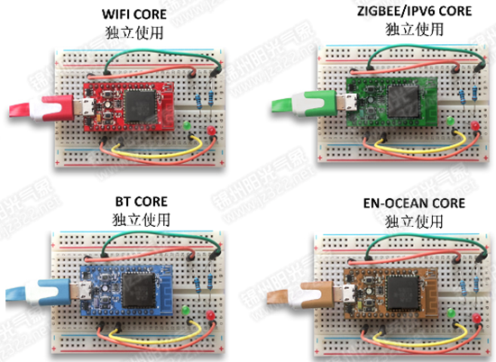 把无线通信核心模块插到智能传感器底板上,便可以组合成各种无线通信形式的传感节点。