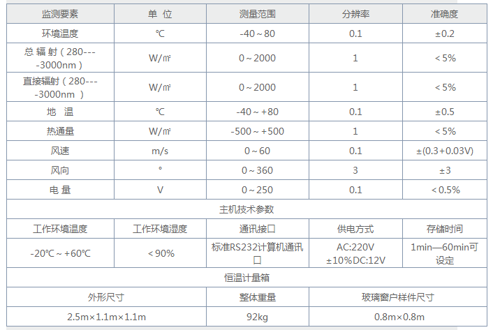 3、系统中的各重要组成部分的具体作用为:①环境温度传感器(含防辐射装置):只测量室外空气温度和恒温计量箱内环境温度;②太阳辐射传感器:一台水平放置测量天空总辐射,一台垂直放置于和测试窗平行的方向,测量窗系统接收到的总垂直太阳辐射照度;③自动跟踪直接辐射传感器:测量玻璃对入设角为0度的太阳直接辐射的透过率,吸收率;④8只温度传感器:分别测量计量箱内表面及窗玻璃的温度;⑤8只热流传感器:测量计量箱内外表面及窗玻璃的热流量;⑥风速风向传感器:测量室外环境的风速风向;⑦电量传感器:测量恒温计量箱内控温系统的用电量;⑧ZY-2B型遮阳系数测试仪:主机用于对各路传感器信号进行采集,计算,存储,显示,组成包括遮阳系数测试系统数据采集器,数据管理微机,遮阳系数测试系统数据分析软件。