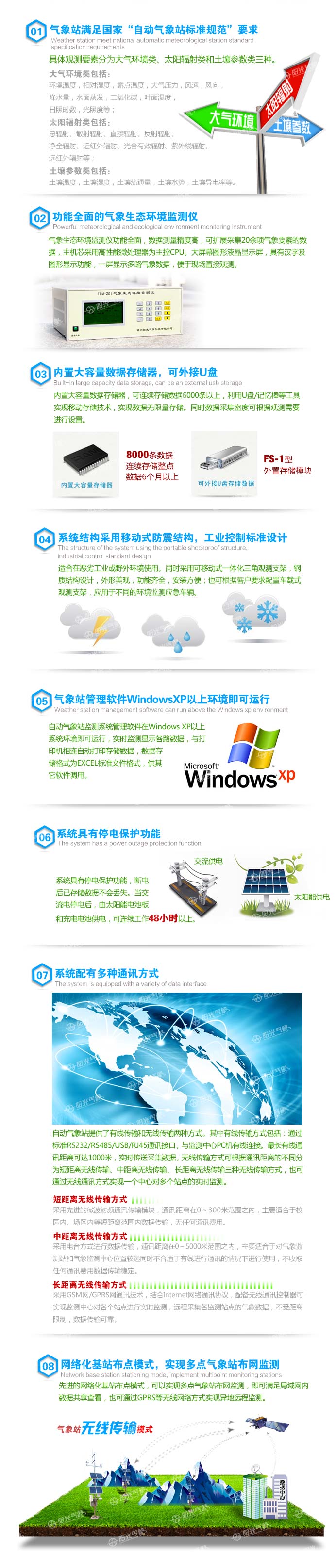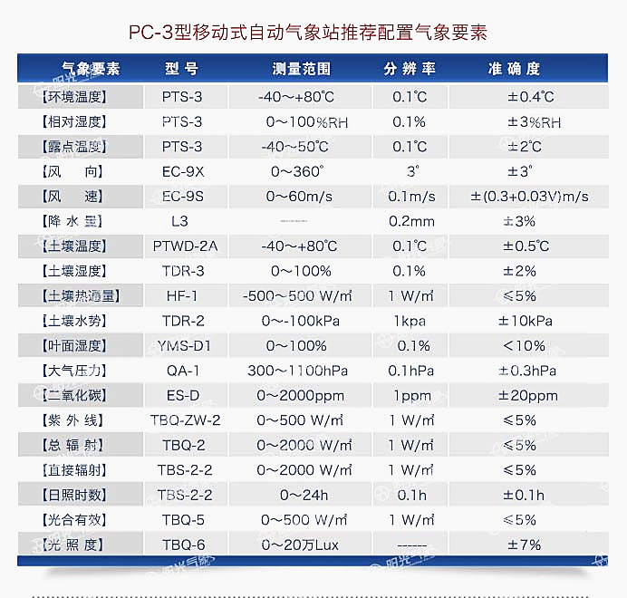 自动气象站是一种能自动地观测和存储气象观测数据的设备,PC-3型移动式自动气象站采用一体化设计,它具有移动观测能力,测量精度高,集成多项气象要素的可移动观测系统,可测量风向、风速、温度、湿度、气压、雨量、光照度、土壤温度、土壤湿度、露点、太阳辐射量、太阳紫外线等多项信息并做公告和趋势分析便于用户对气象数据的使用、分析和处理。该气象站是目前为止国内测量气象要素最全面的小气候观测站,可根据用户需要灵活增加或减少相应的模块和传感器,可满足各类用户的需求。