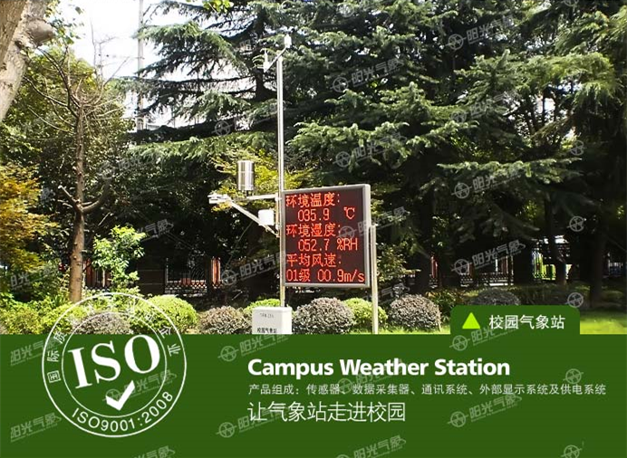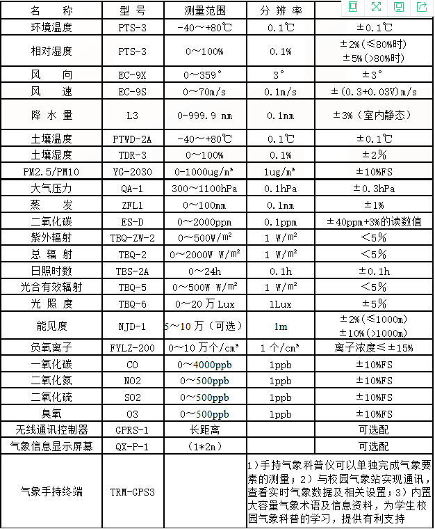 ●本气象站符合WOM国际气象组织标准要求,完全按照国家气象行业标准进行生产; ●采用有线和无线两种数据通讯技术, PC端与手机都可以实时查看数据; ●可配置太阳能供电系统,保证在无电地区长期使用; ●选配LED大屏幕显示,数据展现更直观,便于大家参观学习; ●数据同步上传到学校网站上,方便查看,及时了解天气变化情况。 技术指标
