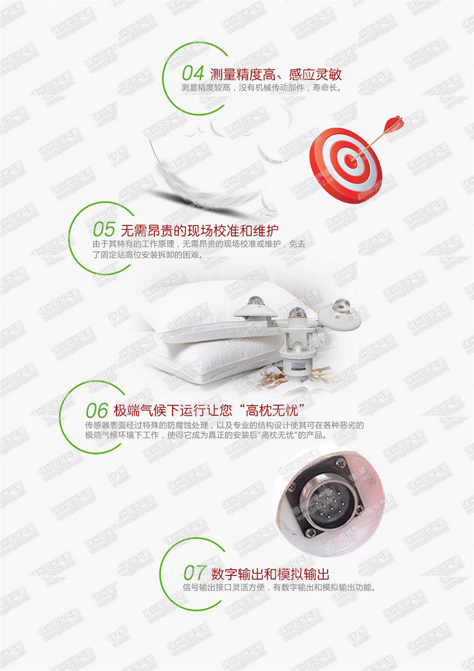3. 采用先进的监测技术,风速风向的监测采用了超声波技术,不但测量精度高,性能稳定,而且无需维护;雨量的监测采用了光学的原理,体积小巧、免维护,更适于用在无人值守的现场。