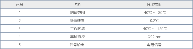 PTWD—4型黑球温度传感器采用精密铂电阻做温度检测元件,配合黑球可获得标准黑球温度值,其中黑球采用标准钢球外表喷涂多层无光黑漆,可对阳光具有很强的吸收传导效果,通过万用表测得铂电阻阻值,然后再通过人工计算获得黑球温度值。