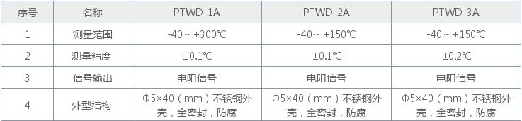 公司生产设计的PTWD系列温度传感器采用不锈钢封装、防水性能良好,选用优质电缆连接使用,结构简单,易于安装、更换。同时根据使用范围和情况的不用设计出多种精度及测量范围的传感器,为用户节省资源,提高产品的性价比。