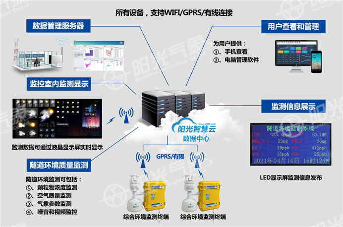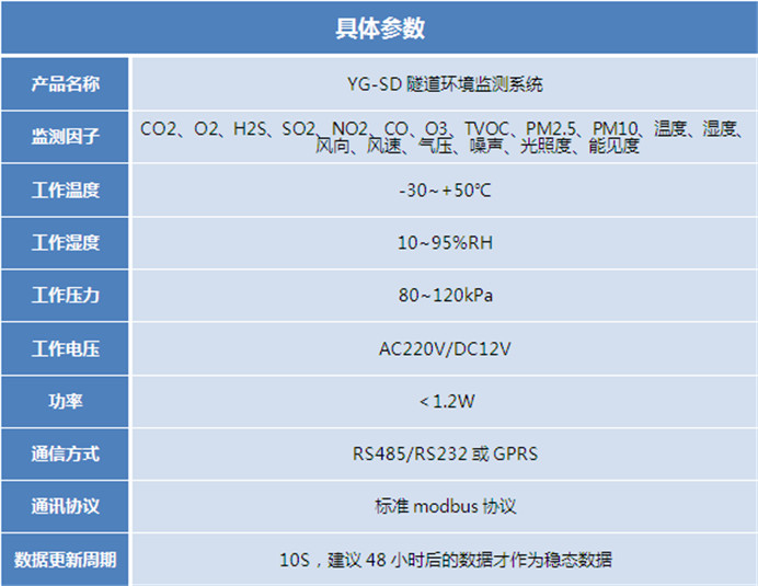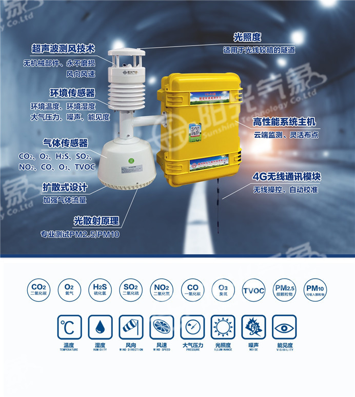 1、 隧道环境监测:气象五参数(风速风向、温湿度、大气压力);AQI七参数(PM2.5、PM10、NO2、CO、SO2、O3、TVOC),光照度、噪声、CO2、O2、H2S、隧道能见度VI等;