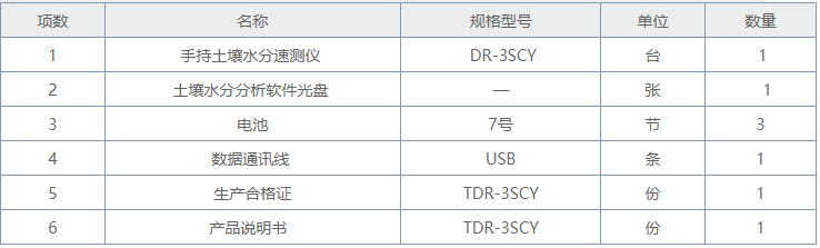 产品组成:TDR-3SCY型手持土壤水分速测仪,土壤水分分析软件光盘,供电电池,数据通讯线等。