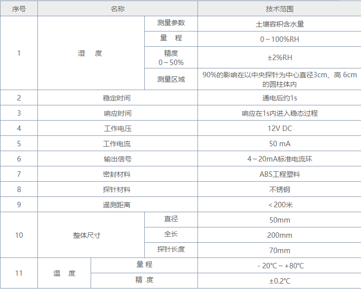 TDR-3A型土壤温湿度传感器具有稳定性高,安装维护操作简便等特点。为了保证强度和寿命其支撑料选择ABS工程塑料。TDR-3A型土壤温湿度传感器密封性好,可长期埋入土壤中使用,不受腐蚀。土壤湿度传感器输出信号采用标准的电流环传送技术,使其抗干扰能力强,传送距离远,测量精度高,响应速度快。