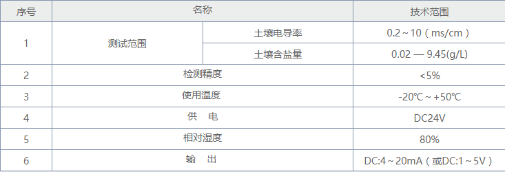 TDR-4土壤电导率传感器具有稳定性高,安装维护操作简便等特点。为了保证强度和寿命其支撑料选择ABS工程塑料。TDR-4土壤电导率传感器密封性 好,可长期埋入土壤中使用,不受腐蚀。土壤湿度传感器输出信号采用标准的电流环传送技术,使其抗干扰能力强,传送距离远,测量精度高,响应速度快。