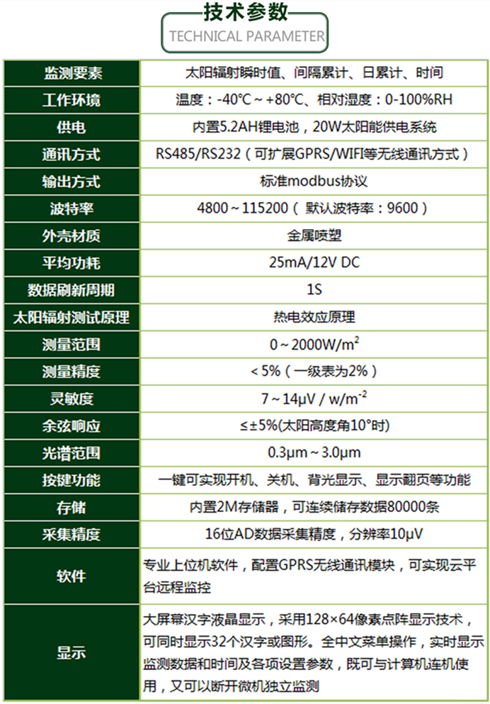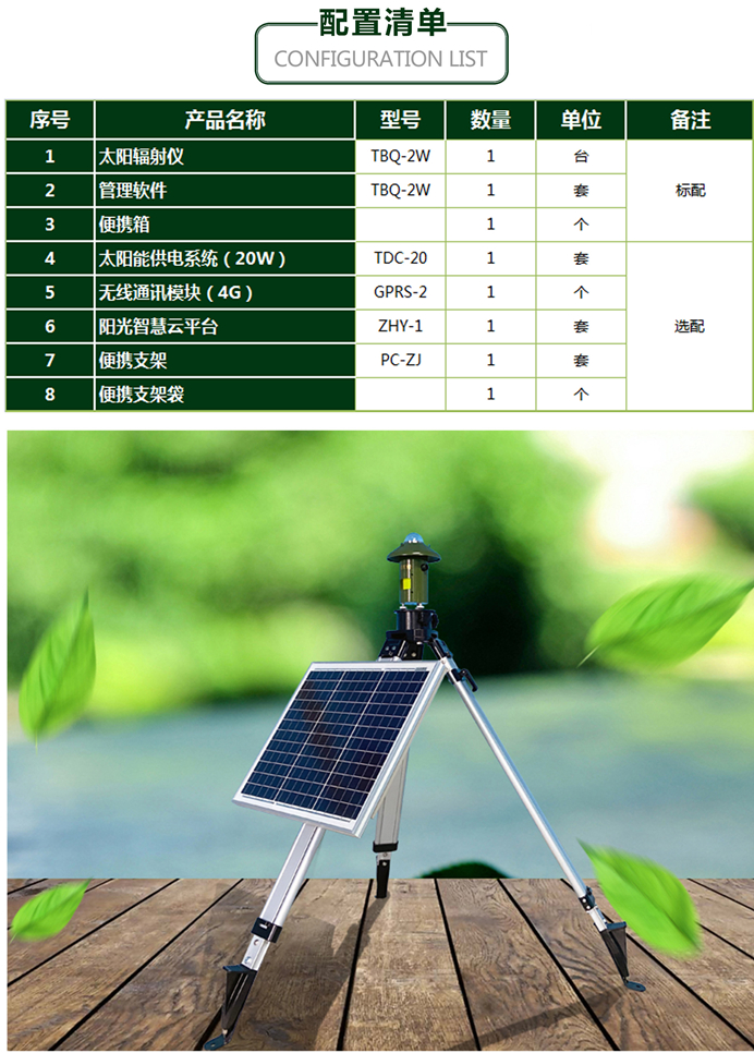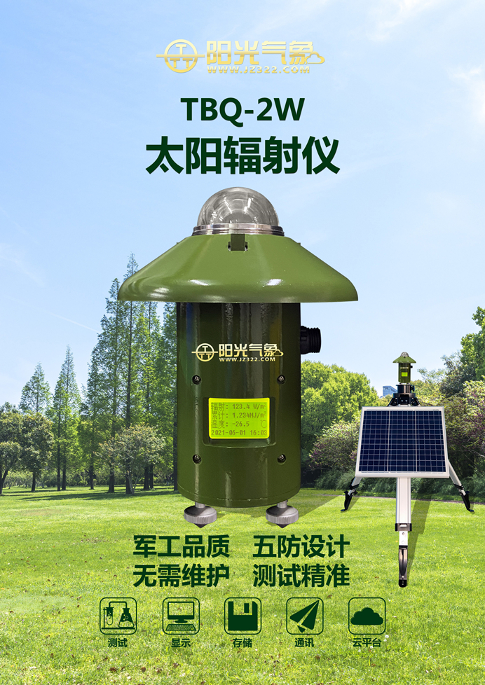 TBQ-2W太阳辐射仪是阳光气象公司研发生产的新一代军工级别的手持辐射仪,它具有体积小、重量轻、精度高、性能稳定等特点,这款产品集监测、显示、存储、通讯等功能于一体,是一款能手持监测的太阳辐射仪。TBQ-2W的研发解决了常规手持辐射仪测量精度低,而高精度辐射产品又系统庞大的问题。另外本产品采用了防腐、防爆、防水、防震、防尘等高防护级别的设计理念,可满足各种特殊环境的使用需求,是军事、航海、科研等领域首选产品。