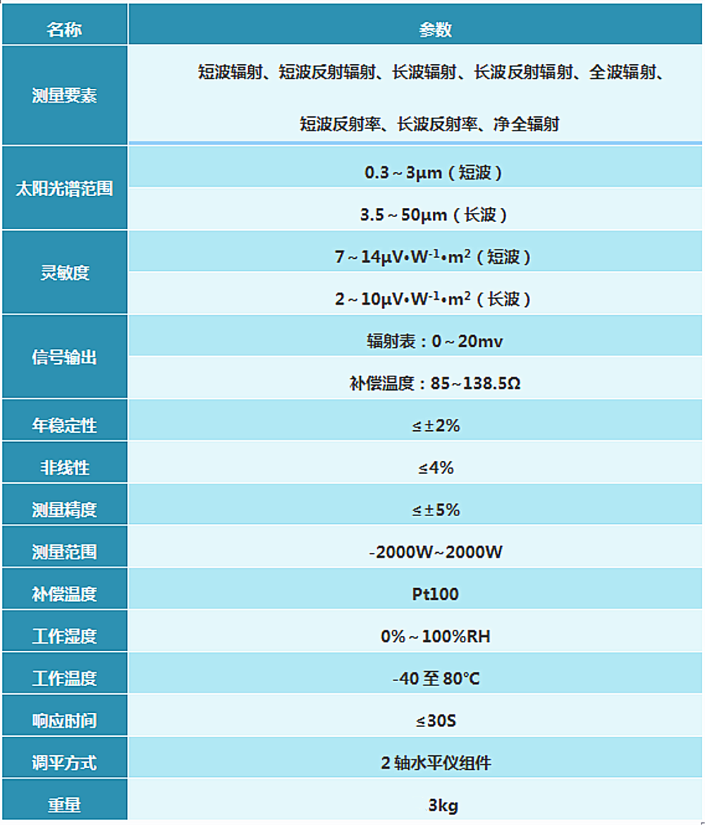 每只辐射表都分别有各自的灵敏度系数和输出导线,可单独输出各个数据,同时通过各自的输出数据进行组合,分别能测量短波辐射、短波反射辐射、长波辐射、长波反射辐射、全波辐射、净全辐射、短波反射率和长波反射率。