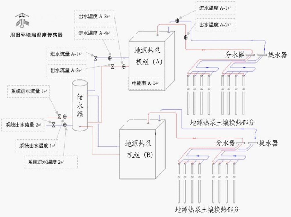 1、计量检测设备包括室内外环境温湿度传感器、系统用户侧进出水温度传感器、系统热源侧进出水温度传感器、系统用户侧循环流量传感器、系统热源侧循环流量传感器、系统耗电量监测电表、机组用户侧进出水温度传感器、机组热源侧进出水温度传感器、机组用户侧循环流量传感器、机组热源侧循环流量传感器、机组输入功率传感器等。