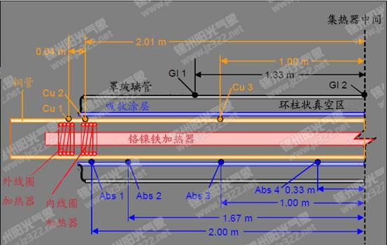 罩玻璃管(Gl)铜管(Cu)和内管(Abs)热偶计在高温管的位置(另一半没有标出)铜管和罩玻璃管表面的热电偶固定方法:用金属丝把热偶计缠绕在表面。