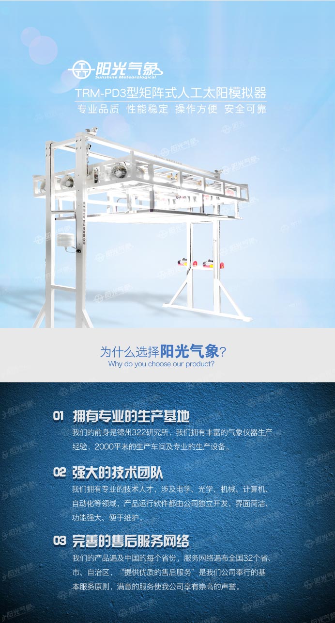 TRM-PD3型矩阵式人工太阳模拟器(面积定制)是锦州阳光科技发展有限公司根据多年太阳模拟器生产经验开发的矩阵式模拟光源(称人造太阳),专用于太阳能产品室内测试的实验设备。TRM-PD3人工太阳模拟器具有操作简单、使用方便,安全可靠的特点。