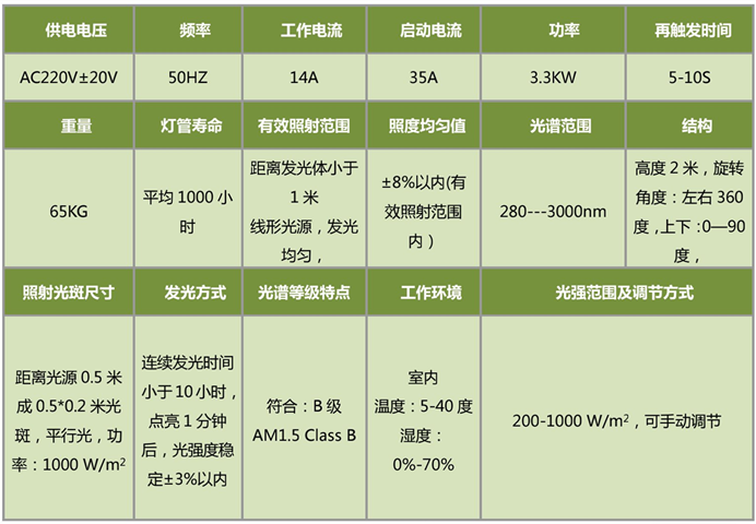 该装置是由光源(氙灯),机构调整,及控制系统等组成,可替代太阳光实现实验室内的小功率阳光模拟实验,可对单、多晶硅组件测试,是目前较理想的室内人工太阳系统。氙灯----“人造小太阳”氙在电场的激发下,能射出类似太阳光的连续光谱。高压长弧氙灯就是利用氙的这一特性制成的。由于这种灯有极大的发光强度和非常接近日光的光色,所以叫做“人造小太阳”。