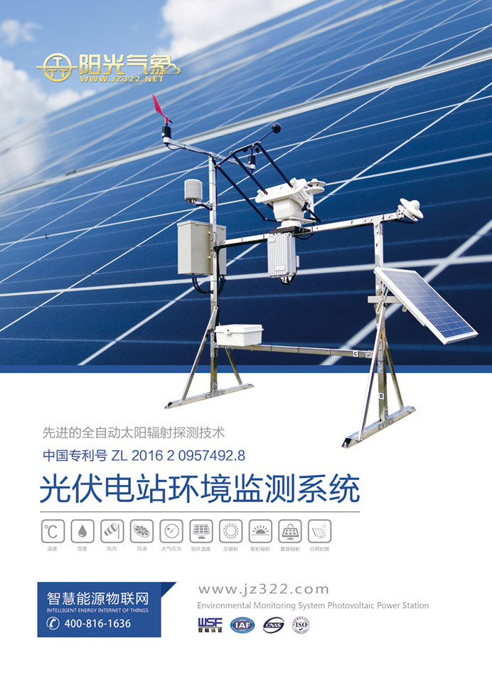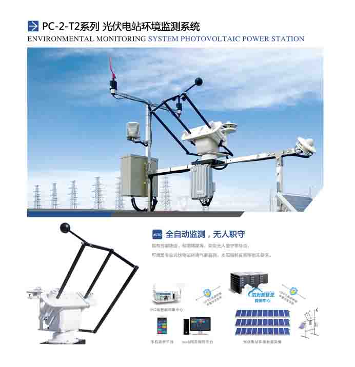 PC-2-T2型光伏电站环境监测系统是我公司按照国际气象WMO组织气象观测标准及IEC(国际电工技术委员会)、国家电网公司企标Q/GDW 617-2011《光伏电站接入电网技术规定》、国家电网公司企标Q/GDW 618-2011《光伏电站接入电网测试规程》等规范标准设计生产研发的新型光伏电站环境监测站,同时也符合《并网光伏发电系统工程验收技术规范》等相关技术要求。本系统可观测的环境辐射要素有:环境温度、环境湿度、组件温度、风速、风向、气压、倾斜总辐射、日照时数、水平总辐射、太阳直接辐射、太阳散射辐射等指标。具有性能稳定,检测精度高,完全无人值守等特点,可满足专业光伏电站环境气象监测、太阳辐射监测等相关要求。